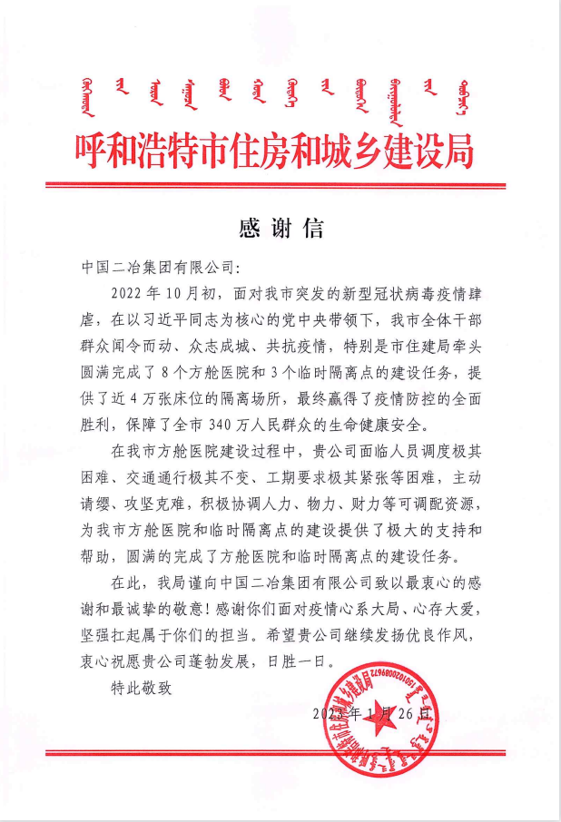 1月31日,呼和浩特市住房和城鄉(xiāng)建設(shè)局致信中國(guó)二冶,對(duì)中國(guó)二冶在抗擊此輪疫情的最緊要關(guān)頭,并肩抗疫、攜手克艱表示感謝。