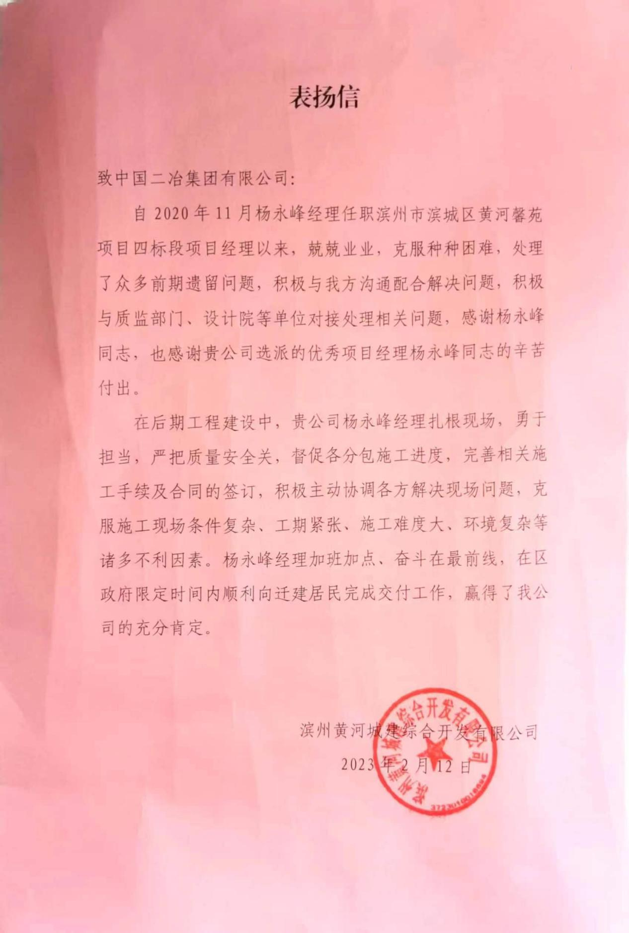 信中對該項目自開工建設以來,項目管理團隊克服重重困難、積極協(xié)調(diào)各方,按時順利向遷建居民完成交付表示肯定。對項目經(jīng)理楊永峰在工程建設期間,帶領項目團隊克服施工現(xiàn)場條件復雜、工期緊張、施工難度大等諸多不利因素,確保各重要節(jié)點的順利完成表示贊揚。信中指出,項目管理團隊始終奮戰(zhàn)在最前線,勇挑重擔、扎根現(xiàn)場,充分發(fā)揚“一天也不耽誤、一天也不懈怠”的企業(yè)精神,嚴保質(zhì)量安全關,督促各分包施工快速推進,完善相關資料,積極主動協(xié)調(diào)各方,解決現(xiàn)場出現(xiàn)的問題,為打造精品工程做出卓越貢獻。同時,希望與中國二冶在后續(xù)工作中,拓寬合作領域,深化合作友誼,實現(xiàn)互惠共贏,在濱洲地區(qū)的工程建設中樹立起央企標桿、展現(xiàn)出央企風貌。