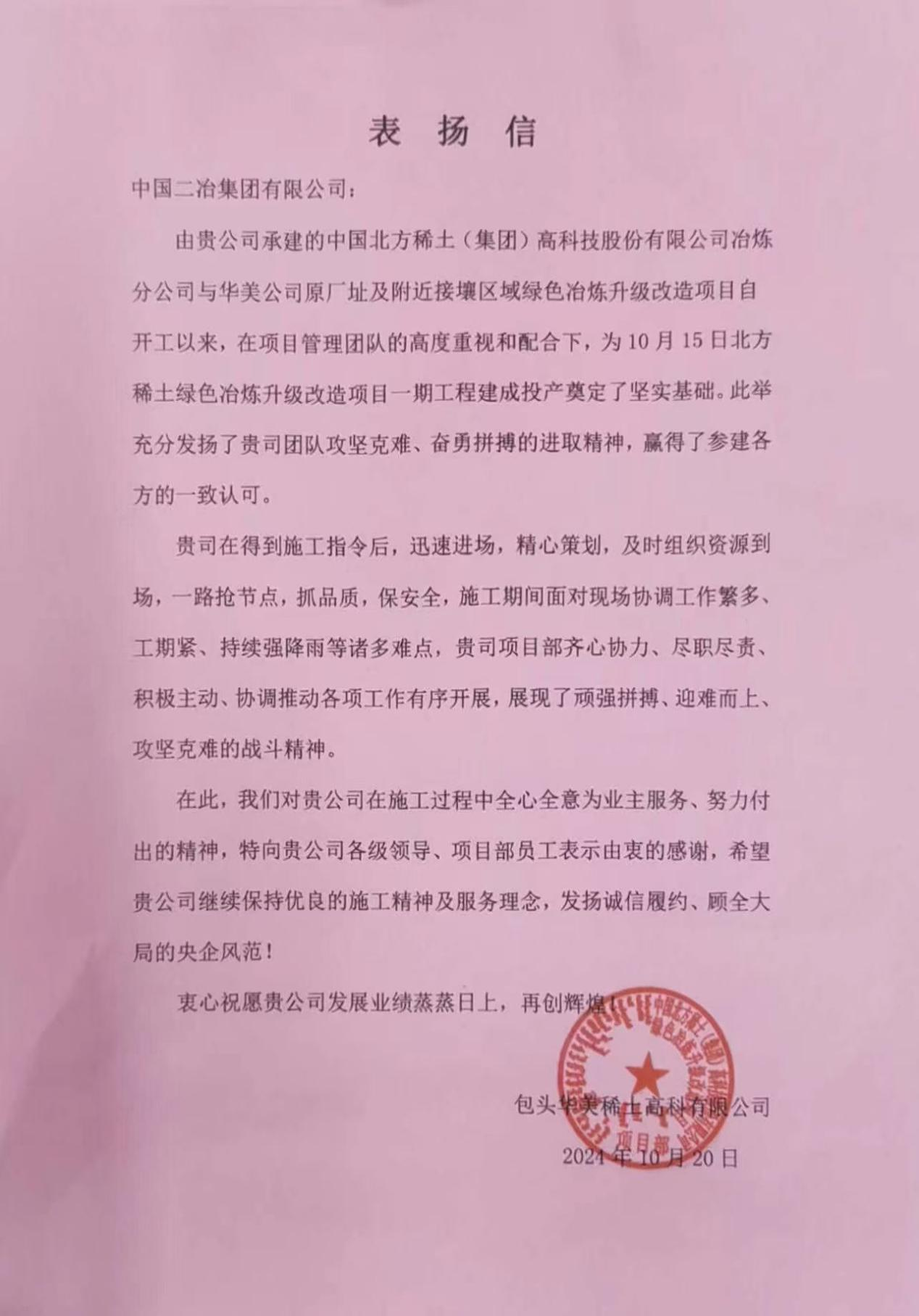 10月23日,中國二冶收到包頭華美稀土高科有限公司表揚信,對中國二冶承建的中國北方稀土(集團)高科技股份有限公司冶煉分公司與華美公司原廠址及附近接壤區(qū)域綠色冶煉升級改造項目在施工過程中秉持敬業(yè)精神、盡心竭力為業(yè)主服務(wù)表示由衷感謝。