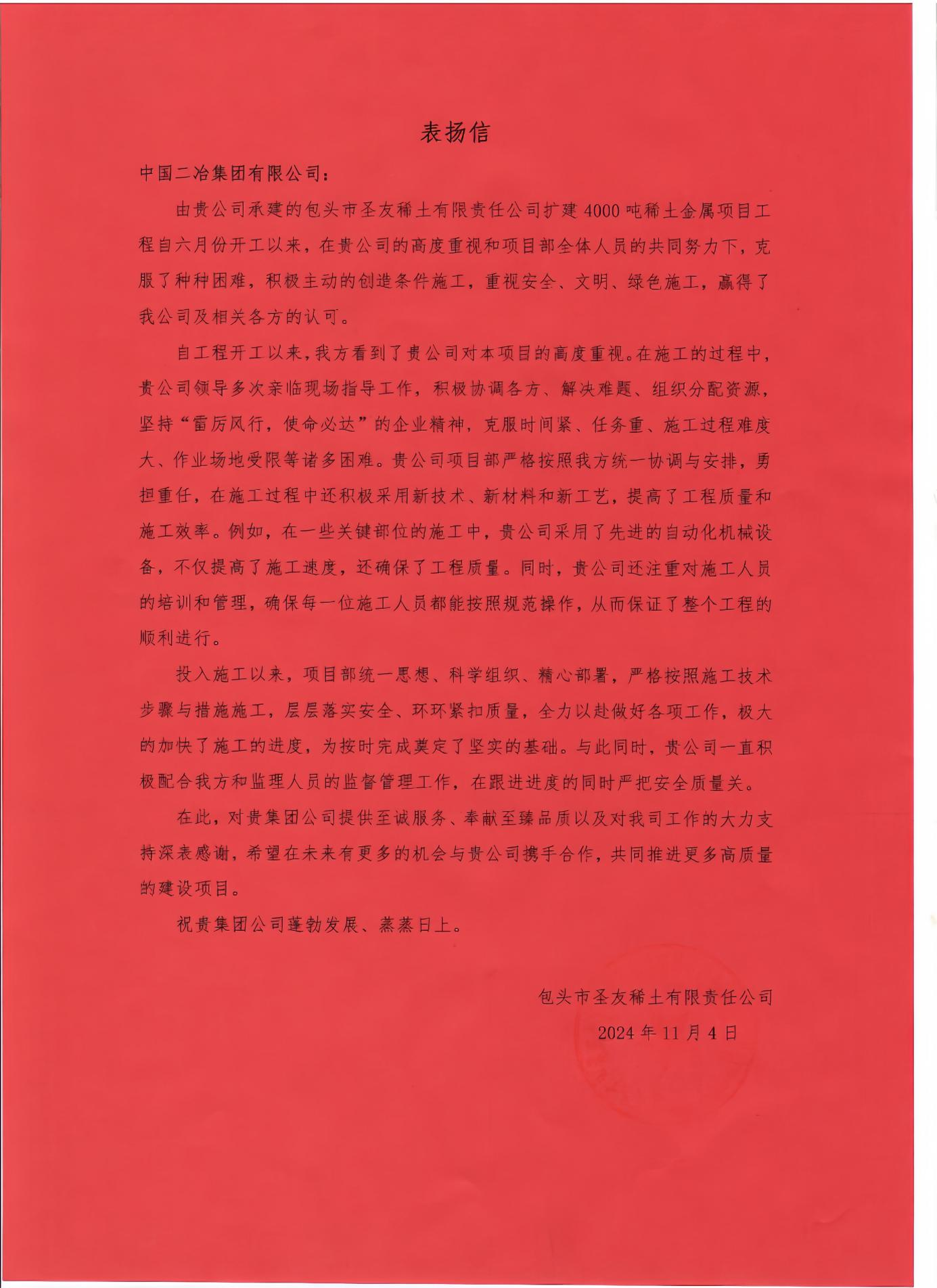 中國二冶收到包頭市圣友稀土有限責任公司表揚信