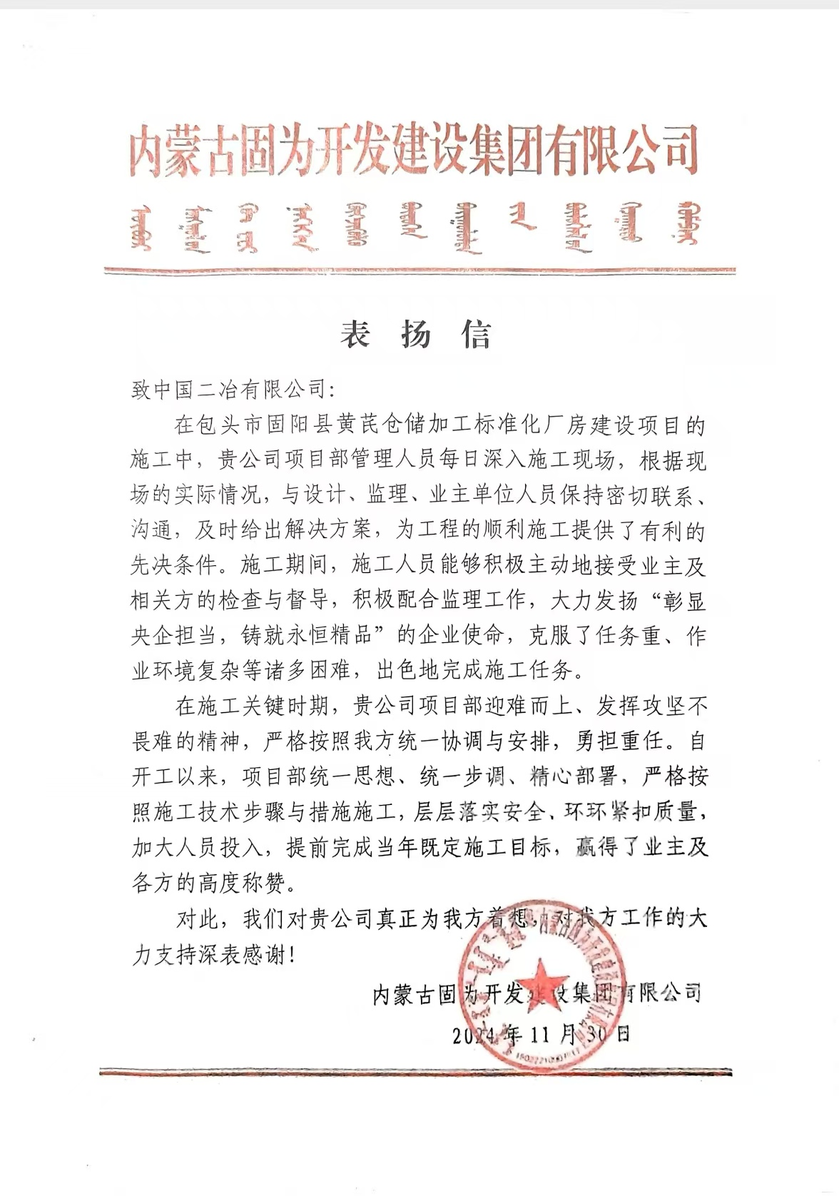 12月2日,中國二冶收到內(nèi)蒙古固為開發(fā)建設(shè)集團(tuán)有限公司發(fā)來的第二封表揚(yáng)信,高度稱贊項目管理團(tuán)隊提前完成固陽縣黃芪倉儲加工標(biāo)準(zhǔn)化廠房建設(shè)項目既定目標(biāo)的杰出表現(xiàn)。