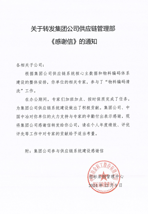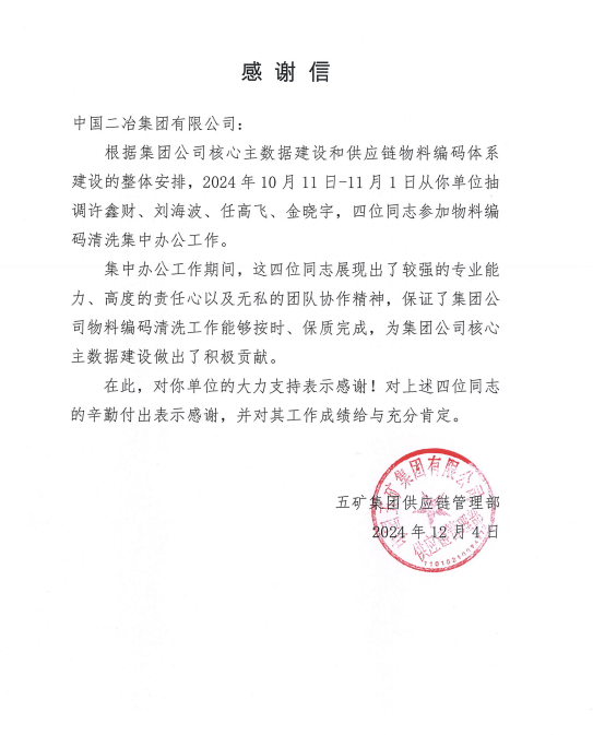 信中指出,根據(jù)集團公司核心主數(shù)據(jù)建設(shè)和供應(yīng)鏈物料編碼體系建設(shè)的整體安排,2024年10月11日-11月1日從你單位抽調(diào)許鑫財、劉海波、任高飛、金曉宇,四位同志參加物料編碼清洗集中辦公工作。集中辦公工作期間,這四位同志展現(xiàn)出了較強的專業(yè)能力、高度的責(zé)任心以及無私的團隊協(xié)作精神,保證了集團公司物料編碼清洗工作能夠按時、保質(zhì)完成,為集團公司核心主數(shù)據(jù)建設(shè)做出了積極貢獻。