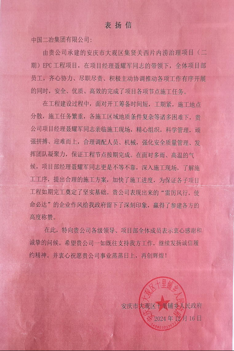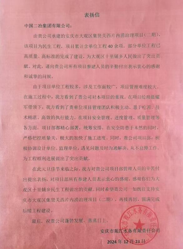 近日,安慶市大觀區(qū)十里鋪鄉(xiāng)人民政府和安慶市觀江水務(wù)有限責任公司給中國二冶發(fā)來表揚信,對安慶市大觀區(qū)集賢關(guān)西片內(nèi)澇治理項目(二期)高質(zhì)量、高標準完成施工任務(wù)給予高度贊揚。