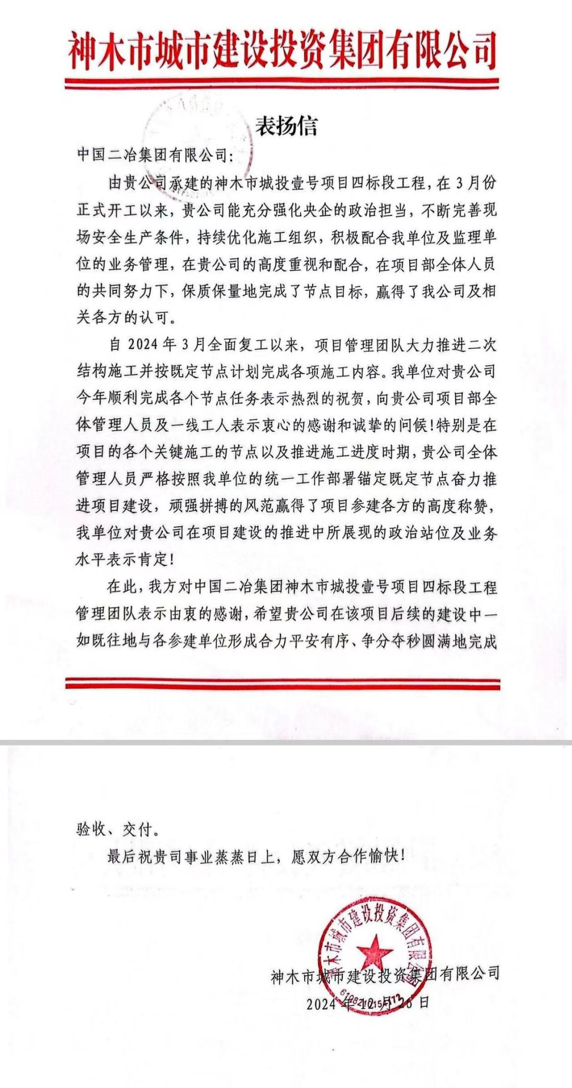 12月26日,中國二冶連續(xù)收到神木市城市建設(shè)投資集團(tuán)有限公司和寶雞市陳倉區(qū)天王中心衛(wèi)生院發(fā)來的表揚(yáng)信。表揚(yáng)信對中國二冶在項(xiàng)目建設(shè)過程中展現(xiàn)出的綜合實(shí)力表示肯定,對項(xiàng)目按計劃實(shí)現(xiàn)工期節(jié)點(diǎn)提出表揚(yáng)。