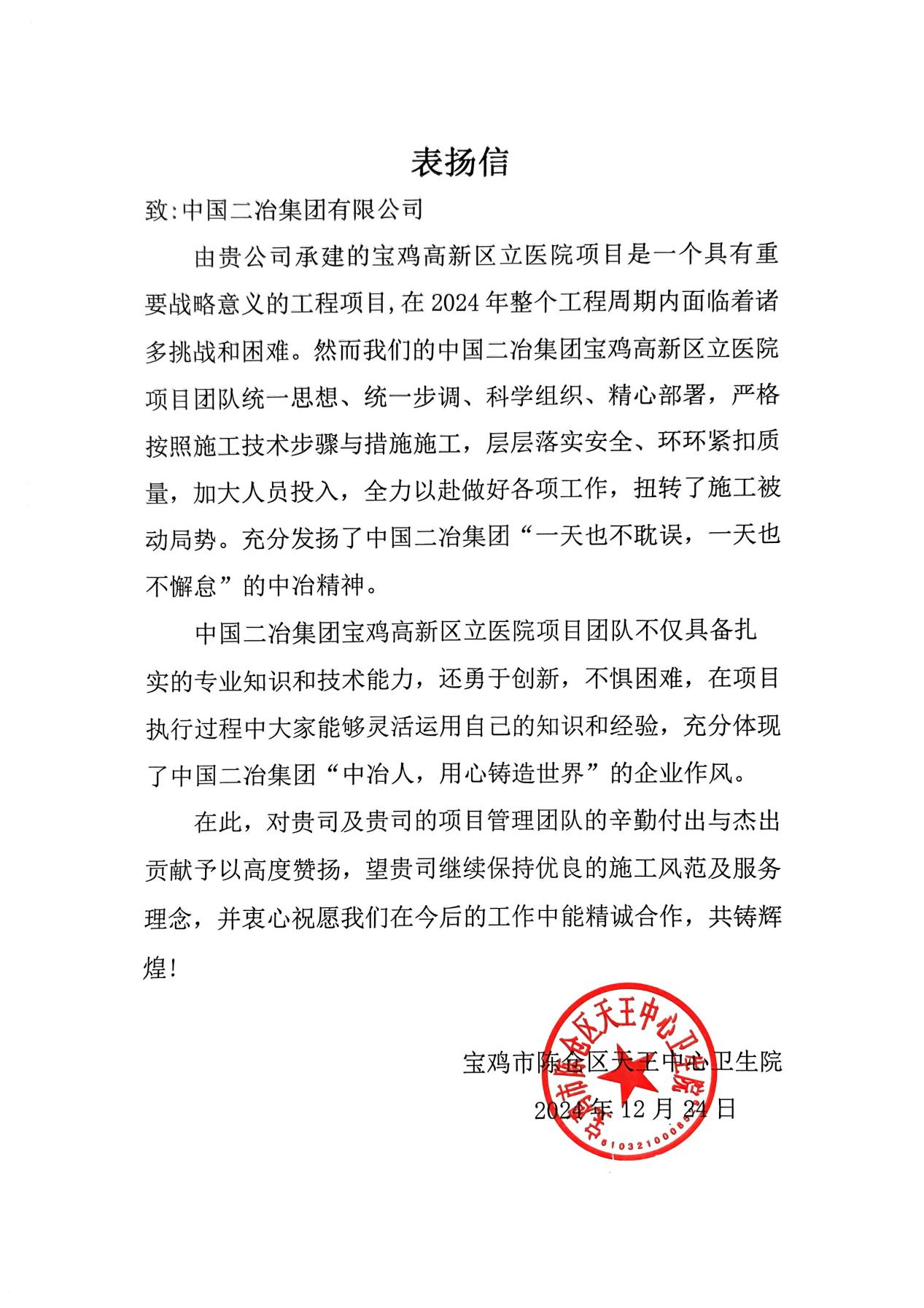 寶雞市陳倉區(qū)天王中心衛(wèi)生院來信對中國二冶寶雞高新區(qū)立醫(yī)院項(xiàng)目管理團(tuán)隊的辛勤付出與杰出貢獻(xiàn)予以高度贊揚(yáng)。在2024年建設(shè)過程中,項(xiàng)目面臨著諸多的困難和挑戰(zhàn),項(xiàng)目部全體人員統(tǒng)一思想、統(tǒng)一步調(diào)、科學(xué)組織、精心部署,層層落實(shí)安全、環(huán)環(huán)緊扣質(zhì)量、全力以赴做好項(xiàng)目建設(shè)各項(xiàng)工作,扭轉(zhuǎn)了施工被動局勢,項(xiàng)目團(tuán)隊不僅具備扎實(shí)的專業(yè)知識和技術(shù)能力,還勇于創(chuàng)新,不懼困難,充分體現(xiàn)了中國二冶“共建一流項(xiàng)目 合創(chuàng)品牌價值”的企業(yè)經(jīng)營理念。寶雞高新區(qū)立醫(yī)院項(xiàng)目是“十四五”期間寶雞市重點(diǎn)項(xiàng)目,是一所集醫(yī)療、教學(xué)、科研、預(yù)防、保健、康復(fù)于一體的綜合性三級甲等綜合醫(yī)院,建成后將提高寶雞市高新區(qū)區(qū)域衛(wèi)生服務(wù)水平,極大緩解寶雞市東部和南部區(qū)域醫(yī)療資源不足的局面。