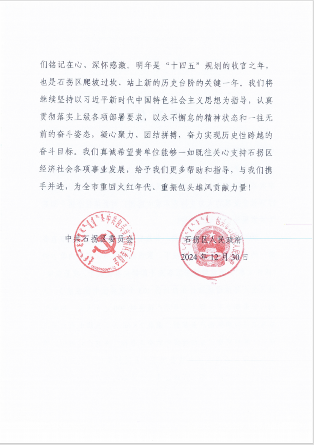 信中最后,石拐區(qū)政府真誠希望中國二冶能夠一如既往關(guān)心支持石拐區(qū)經(jīng)濟社會各項事業(yè)發(fā)展,給予石拐區(qū)更多幫助和指導,并攜手并進,為全市重回火紅年代、重振包頭雄風貢獻力量!