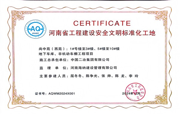 近日,由中國二冶承建的尚中苑(西苑)工程項目榮獲河南省工程建設(shè)協(xié)會“河南省工程建設(shè)安全文明標(biāo)準(zhǔn)化工地”榮譽稱號。