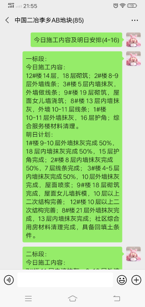 在集團(tuán)和分公司掀起大干二季度,決勝“雙過半”動(dòng)員會(huì)后,李鄉(xiāng)一期(AB地塊)項(xiàng)目部倒排工期,重新制定施工進(jìn)度計(jì)劃,統(tǒng)計(jì)剩余施工產(chǎn)值總量,合理分?jǐn)偟矫吭?,再?xì)化到每天需要完成的產(chǎn)值,根據(jù)產(chǎn)值安排每天需完成的施工任務(wù)及次日計(jì)劃,于每晚在工程微信群里發(fā)布,要求相關(guān)管理人員仔細(xì)查看及回復(fù),并做好監(jiān)督與統(tǒng)計(jì),針對(duì)當(dāng)日未完成的施工任務(wù),要求負(fù)責(zé)人做出解釋及解決辦法,計(jì)入項(xiàng)目部月底考核,嚴(yán)格執(zhí)行獎(jiǎng)懲制度。