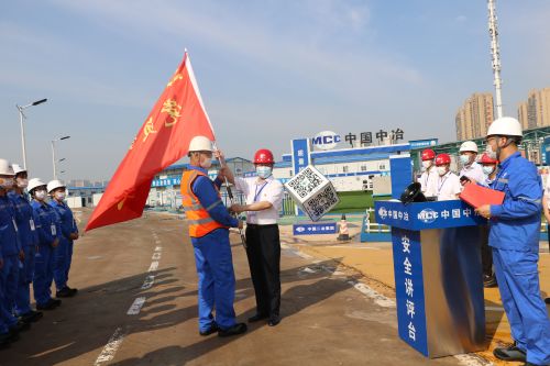 在施工現(xiàn)場(chǎng)舉行的授旗儀式上,建設(shè)單位工程管理部張得利部長(zhǎng)為工人先鋒隊(duì)授旗,湖北分公司總經(jīng)理甄永明為青年突擊隊(duì)授旗,湖北分公司黨總支書(shū)記、副總經(jīng)理陳文革為黨員突擊隊(duì)授旗。隊(duì)員們?cè)陬I(lǐng)誓下齊聲宣誓:堅(jiān)決做到“最艱苦的擔(dān)子我們挑,最危險(xiǎn)的地方我們?nèi)?,最緊急的關(guān)頭我們上,最困難的時(shí)刻我們到”。遵守組織紀(jì)律,服從工作安排,吃苦在前,沖鋒在先,安全、優(yōu)質(zhì)完成任務(wù),為隊(duì)旗增光,為公司貢獻(xiàn)力量!