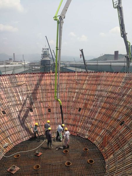 廣元中孚綠色鋁材項目電解車間一工段氧化鋁供配料含氟倉,其高21.55米,上部漏斗采用混凝土結(jié)構(gòu),漏斗上部直徑19.3米,下部直徑8.4米,施工難度非常大。面對這項艱巨的施工任務(wù),雖然難度很大,但項目部技術(shù)組人員迎難而上,經(jīng)過認(rèn)真計算和與相關(guān)專家的積極溝通,制定了細(xì)致周密的施工方案,通過各方專家論證,最終敲定了實施方案。項目部制定了相應(yīng)的安全措施及質(zhì)量目標(biāo),在兩個月零六天的奮戰(zhàn)中,相繼完成架手架搭設(shè)、鋼筋綁扎、模板支護(hù)等所有任務(wù),5月28日,監(jiān)理、業(yè)主等相關(guān)方通過檢查認(rèn)證,確認(rèn)符合澆筑條件,并下達(dá)了澆筑令。項目部立即組織施工,技術(shù)質(zhì)量安全等黨員責(zé)任區(qū)及突擊隊員緊盯施工現(xiàn)場執(zhí)行監(jiān)護(hù),20多個小時連續(xù)作業(yè)后,于是5月29日凌晨4點30分,順利完成了施工任務(wù),項目部又啃下了一塊硬骨頭,為整體工程順利完工奠定了基礎(chǔ)。