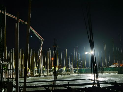 人勤春來早,實干正當時,施工現(xiàn)場整天一片熱火朝天的施工景象,穿梭的土方車輛、隆隆的挖機轟鳴聲、緊張有序的施工作業(yè)人員,挑燈夜戰(zhàn)搶工期,現(xiàn)場構成一片繁忙的施工畫面。該項目部根據(jù)實際情況,針對各施工班組制訂各階段施工節(jié)點計劃,在保證安全質(zhì)量的前提下,確保按期完成建設任務,認真落實工期和產(chǎn)值目標。目前該項目售樓部主體結構全部封頂,工人每天都在披星戴月、挑燈夜戰(zhàn)加班加點搶抓二次結構砌筑、裝飾裝修工期節(jié)點,確保售樓部5月份順利交付使用,目前售樓部單日施工作業(yè)人數(shù)可達80余人;基坑支護工程也再緊鑼密鼓的施工當中,南方連日降雨,也為基坑施工作業(yè)帶來了巨大的挑戰(zhàn),作業(yè)人員整日穿著雨具“泡”在水里綁鋼筋、支模板,為了不耽誤現(xiàn)場作業(yè)人員施工業(yè),食堂將午飯送到施工現(xiàn)場,作業(yè)人員也只是簡單的應付一下后繼續(xù)投入到緊張的“戰(zhàn)斗”當中。