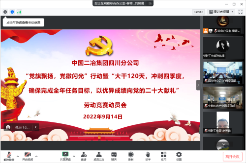 分公司紀(jì)委書記、副總經(jīng)理鐘云宣讀了《中國二冶集團(tuán)四川分公司黨委開展“黨旗飄揚(yáng)、黨徽閃光”行動暨“大干 120 天、沖刺四季度,確保完成全年任務(wù)目標(biāo),以優(yōu)異成績向黨的二十大獻(xiàn)禮”勞動競賽活動方案》和各項目部 “四個一批”、“黨建+”創(chuàng)建情況。江油鋰電池項目、瀘州老窖項目、宜賓二醫(yī)院項目進(jìn)行表態(tài)發(fā)言。