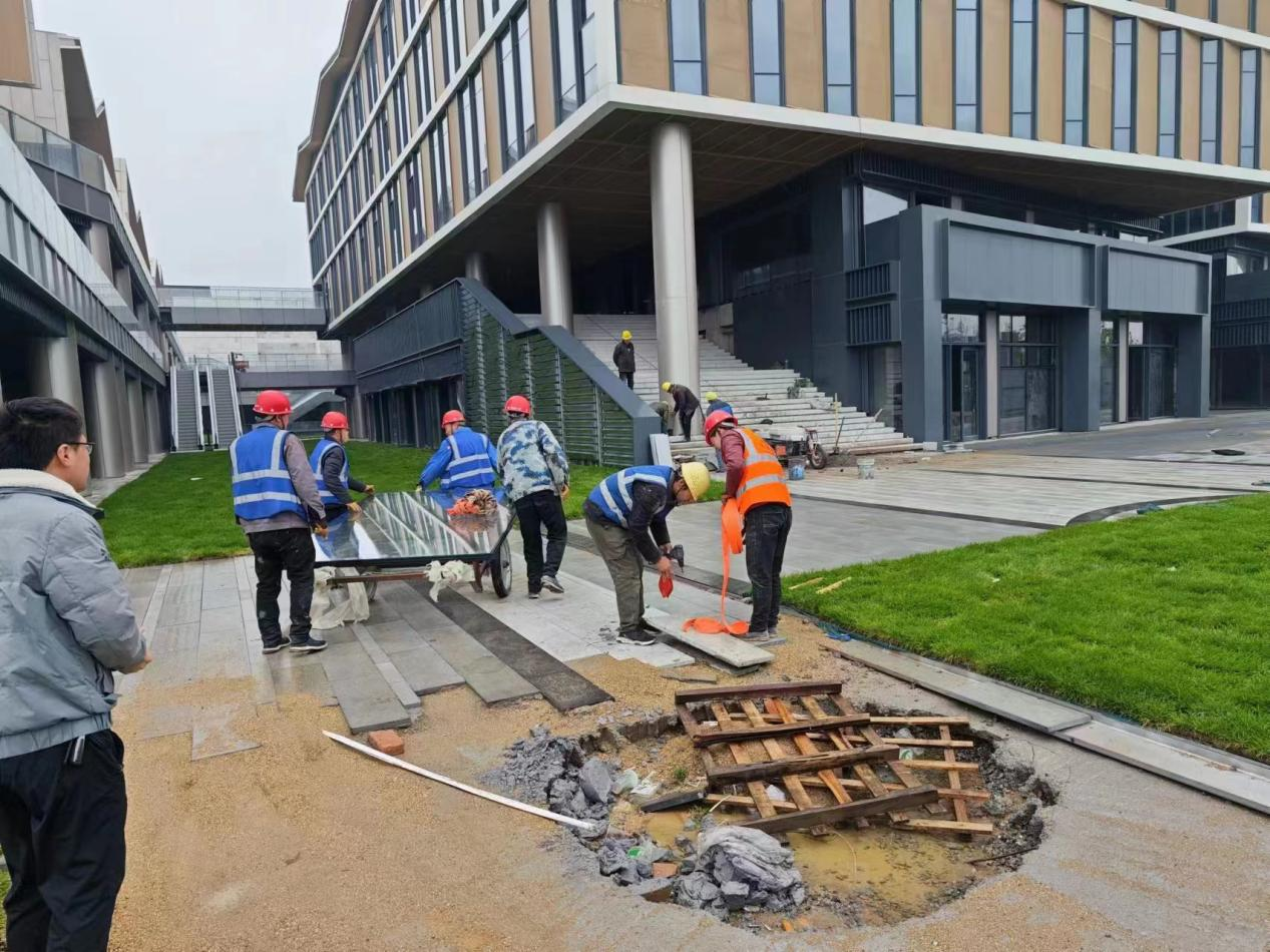 在如意東路便民服務中心項目施工現(xiàn)場,項目負責人帶頭加班加點、爭分奪秒投入項目工作中。目前主體工程已全部完成,道路硬化完成,幕墻工程、水電安裝工程、消防安裝工程、精裝工程、景觀工程均在收尾中。確保進度的同時項目部細心施工,精益求精,堅持將安全文明施工落實到位,全力保障竣工驗收,確保雙過半。